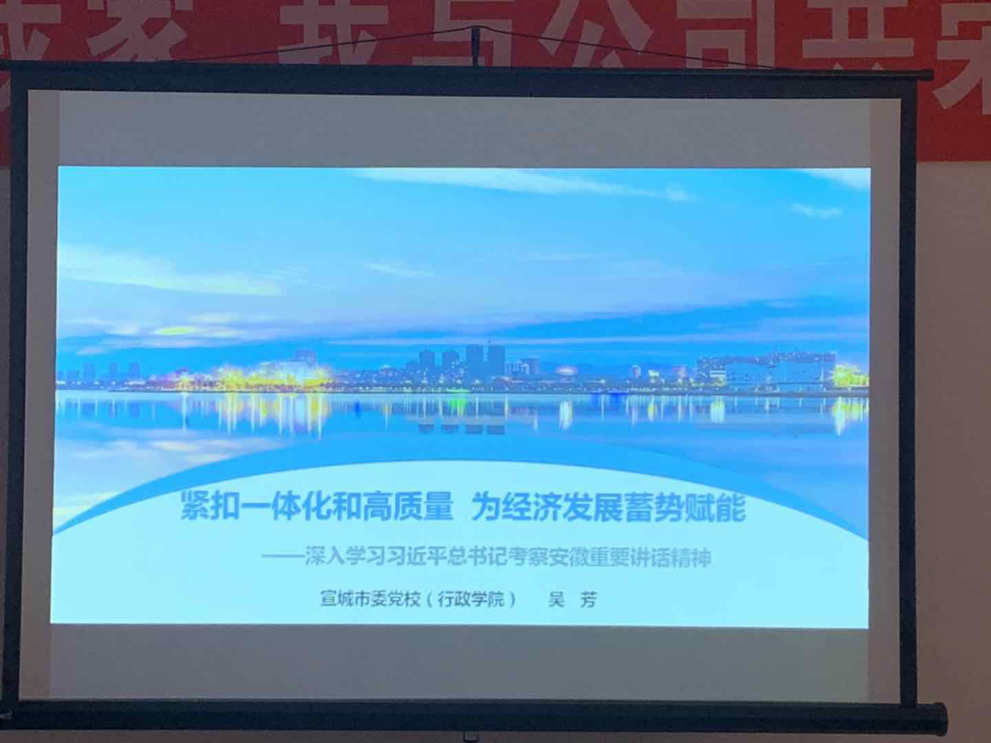 為進(jìn)一步深入學(xué)習(xí)貫徹落實(shí)習(xí)近平總書記考察安徽講話精神,按照集團(tuán)公司“城建集團(tuán)是我家,我與公司共榮辱”大討論活動(dòng)統(tǒng)一部署,24日上午,市城建置業(yè)公司黨支部邀請(qǐng)市委黨校吳芳副教授講授《緊扣一體化和高質(zhì)量 為經(jīng)濟(jì)發(fā)展蓄勢(shì)賦能》主題黨課,公司全體人員參加學(xué)習(xí)。課上,吳教授從習(xí)近平總書記考察安徽重要講話的意義及主要內(nèi)容、貫徹落實(shí)扎實(shí)推進(jìn)長(zhǎng)三角一體化發(fā)展座談會(huì)精神和推動(dòng)習(xí)近平總書記考察安徽重要講話在宣城落地生根三個(gè)方面深入闡述了習(xí)近平總書記考察安徽重要講話精神的豐富內(nèi)涵和意義。