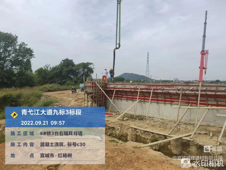 對(duì)青弋江大道九標(biāo)3標(biāo)段5#橋2#墩右幅蓋梁、6#橋3臺(tái)右幅耳背墻進(jìn)行混凝土澆筑;幕溪和府鋼筋交付32.369噸。