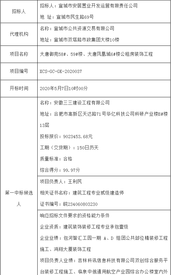 大唐御苑58#、59#樓、大唐鳳凰城6#樓公租房裝飾工程中標候選人公示